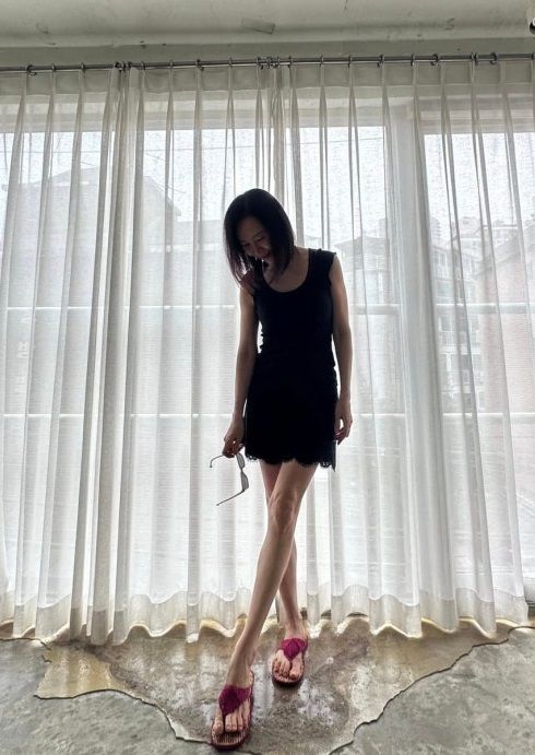 사진 속 채시라는 블랙 미니원피스에 핑크색 슬리퍼를 매치해 세련된 분위기를 자아냈다.