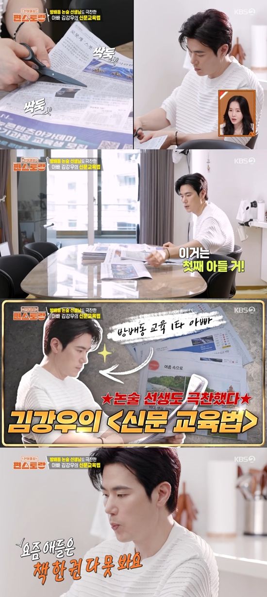 김강우는 "어린이 신문을 같이 시켰다. 제가 어렸을 때는 학교에서 매일 봤다"라고 밝혔다. 또 "다 보길 원하지는 않는다. 이렇게 던져놓으면 일주일에 2~3번은 볼 거다. 절대 억지로 강요하지 않는다. 화장실에도 붙여놓는다. 안 봐도 되지만 보게 된다. 그리고 저랑 얘기를 나눈다"라며 비결을 공개했다.