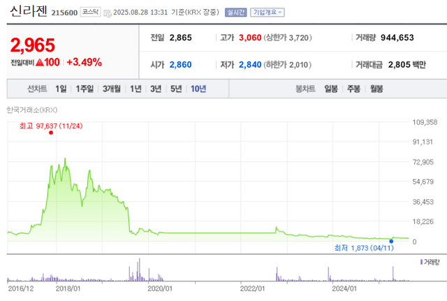 사진 = 신라젠 주가 추이 (네이버증권) 2025년 8월 28일