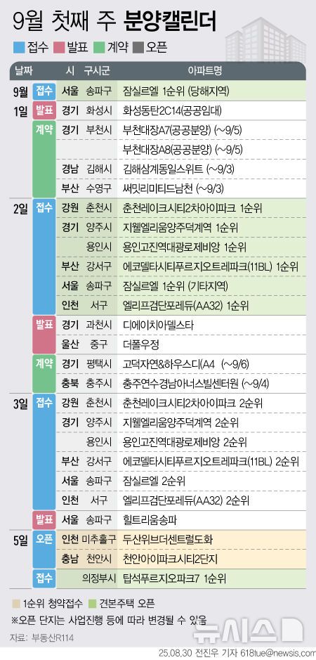 뉴시스 보도에 따르면, 청약 접수는 서울 송파구 신천동 '잠실르엘', 경기 용인시 고림동 '용인고진역대광로제비앙', 강원 춘천시 삼천동 '춘천레이크시티2차아이파크' 등에서 진행된다. 견본주택은 인천 미추홀구 도화동 '두산위브더센트럴도화', 충남 천안시 부대동 '천안아이파크시티2단지' 2곳이 문을 연다.