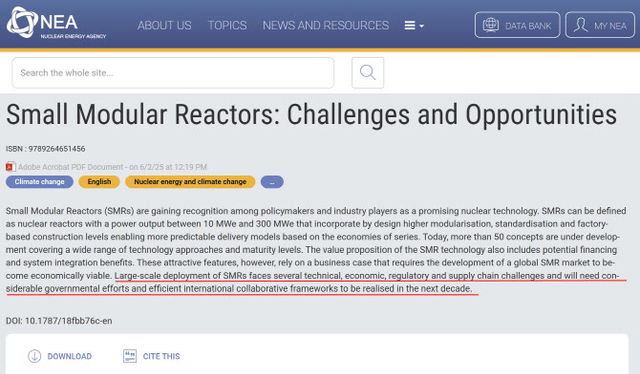 경제협력개발기구(OECD) 산하 원자력에너지기구(Nuclear Energy Agency·NEA)도 보고서에서 “SMR의 대규모 배치에는 기술적, 경제적, 규제적, 공급망상의 여러 도전 과제가 있다”며 “이를 실현하려면 상당한 정부 노력과 효율적인 국제 협력 프레임워크가 필요하다”고 지적하고 있습니다.
