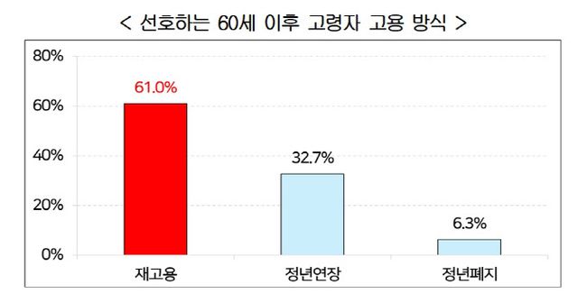 한편 응답 기업의 64.1%는 법정 정년 이후 고령자를 계속 고용한 경험이 있다고 답했으며, 이 가운데 80.9%가 ‘재고용’ 방식을 활용했다고 밝혔다.