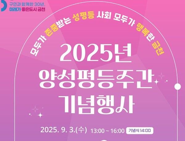 서울 금천구(구청장 유성훈)는 다음 달 3일 오후 1시부터 4시까지 금천구청 대강당에서 '2025년 양성평등주간 기념행사'를 개최한다고 31일 밝혔다.
