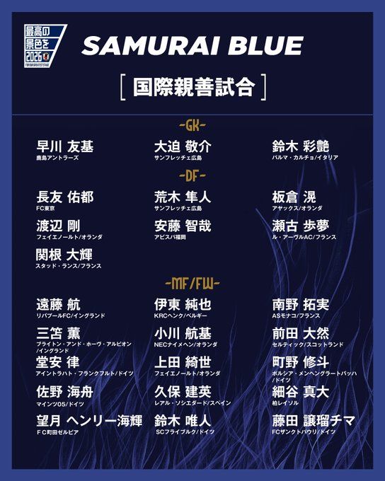 이번 명단은 부상으로 장기 이탈 중인 수비수 도미야스 다케히로와 이토 히로키, 가마다 다이치, 마치다 히로키, 다카이 고타 등 빅리그에서 뛰고 있거나 뛰었던 선수들의 결원이 대거 발생한 상황 속에서도 해외파 선수들이 곳곳에 포함되면서 눈길을 끈다.