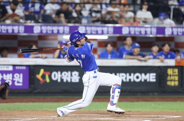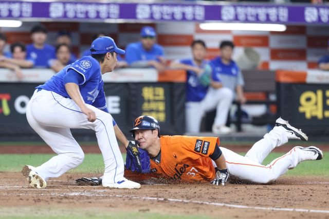 이때 3루를 돌아 득점을 노린 김인환이 홈 베이스에서 태그아웃됐다. 후속타자 손아섭의 볼넷으로 만들어진 2사 1, 2루에서 이도윤이 중견수 뜬공으로 물러나며 이닝이 종료됐다.