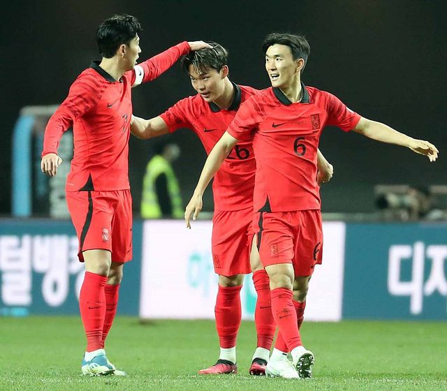 대한민국 축구 국가대표팀 오현규가 2023년 3월 28일 오후 서울 마포구 서울월드컵경기장에서 열린 축구 국가대표 평가전 대한민국과 우루과이의 경기에서 동점을 성공키킨 뒤 손흥민, 황인범과 기쁨을 나누고 있다 / 뉴스1