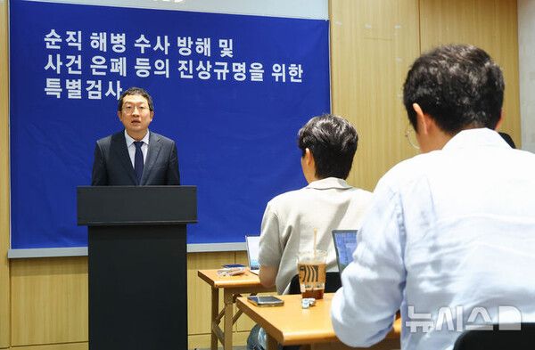 정 특검보는 "공수처는 2023년 8월 말경 채상병 사건에 대한 수사외압 의혹 관련 직권남용 혐의의 고발장을 접수받았다"며 "2024년 6월경 이종호 전 대표가 참여한 멋쟁해병 단체방 존재 알려졌고 김건희의 측근인 이 전 대표가 임성근의 구명로비 통로가 아니냐는 의혹 제기됐다"고 말했다.