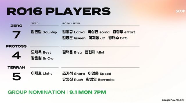 SOOP은 블리자드 엔터테인먼트의 RTS 게임 '스타크래프트: 리마스터'로 진행되는 e스포츠 리그 '구글 플레이 ASL 시즌20'의 16강 조 지명식을 진행한다고 1일 밝혔다.