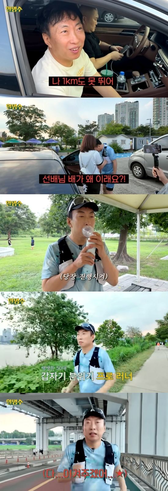 55세인 박명수는 "5km까지 하겠다"며 늦게 온 30대 스태프들에게 "왜 이렇게 못 뛰어"라고 잡도리해 웃음을 자아냈다.