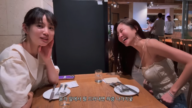 윤승아는 “너무 예뻐서 같이 찍기 부담스럽다. 팔도 얇아서 난 일부러 가리고 나왔다. 팔뚝 드러내면 짜증 난다”고 농담을 던지며 웃음을 자아냈다. 이에 김윤지는 “이거 쇼츠로 만들어야겠다. 윤승아 망언”이라고 받아쳤다.