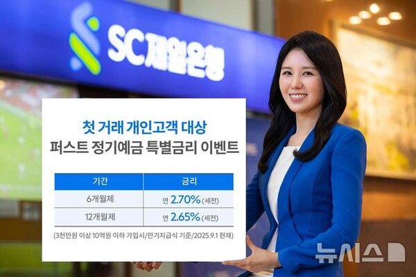 뉴시스 보도에 따르면, SC제일은행 영업점을 통해 퍼스트정기예금에 3000만원 이상~10억원 이하로 가입하는 첫 거래 개인 고객이 대상이다. 6개월제 가입시 최고 2.7%, 12개월제 가입시 최고 2.65%의 특별금리가 제공된다. 총 모집한도는 3000억원으로 한도가 소진되면 이벤트는 조기 종료된다.