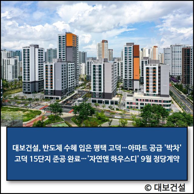 대보건설이 최근 삼성전자 평택캠퍼스 인근 '평택고덕 15단지 아파트' 준공 전경을 공개했다. 한국토지주택공사(LH)가 발주한 이 아파트는 지하 1층, 지상 11~25층 10개동 1295가구 규모로 2022년 11월 착공해 올해 6월 완공했다.