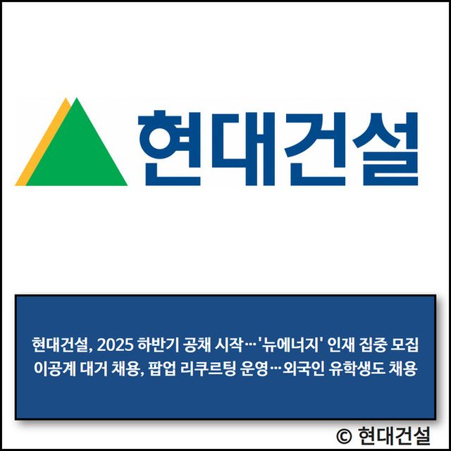 또한 현대건설은 오는 15일부터 19일까지 신사동 디에이치 갤러리에서 팝업 리쿠르팅을 열고 △채용 설명회 △직무 특강 △모의 면접 △상담 등을 운영할 예정이다. 외국인 유학생도 별도로 채용이 진행된다. 또 이공계 전공자를 중심으로 폭넓은 모집이 이뤄진다.