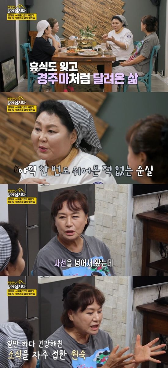 바쁘게 일하는 이순실에게 박원숙은 "사선을 넘어서 왔는데 좀 쉬고 본인 자신을 위해라. '배가 고파서 왔다'고 했는데, 일에만 빠져있다가 어느 날 '좀 쉬어볼까' 하는데 덜컥 병에 걸렸다는 얘기를 너무 많이 들었다"라고 조언했다.
