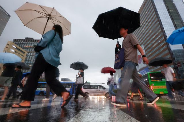 종로구 광화문 네거리에서 우산을 쓴 시민들이 길을 건너고 있다. (사진=연합뉴스)
