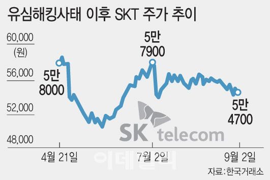 2일 엠피닥터에 따르면 SK텔레콤(017670)은 이날 전 거래일 대비 0.18% 내린 5만 4700원에 거래를 마쳤다. 지난 4월 말 유심 해킹 사태 이후 SK텔레콤 주가는 5월 22일 장중 5만 400원 저점을 찍고 회복세를 보였지만 이내 방향성을 정하지 못하고 횡보하고 있다.