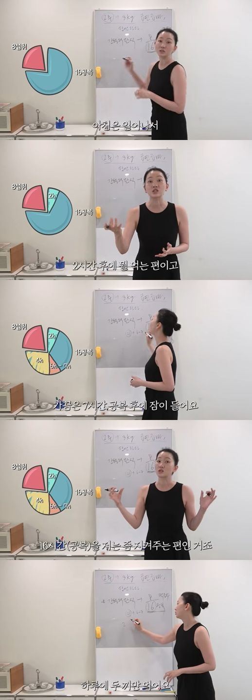 그는 "바캉스를 다녀온 후에 나의 루틴이 다 깨졌다"며 "돌아와서 다시 시작하는 게 뭐냐, 여러분도 너무나 잘 아는 간헐적 단식"이라고 소개했다.