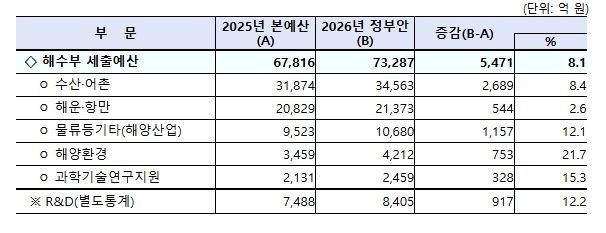 [와이뉴스] 해양수산부는 2026년 정부 예산안을 올해 예산 6조 7,816억 원 보다 8.1%(5,471억 원) 증가한 7조 3,287억 원으로 편성했다고 밝혔다.