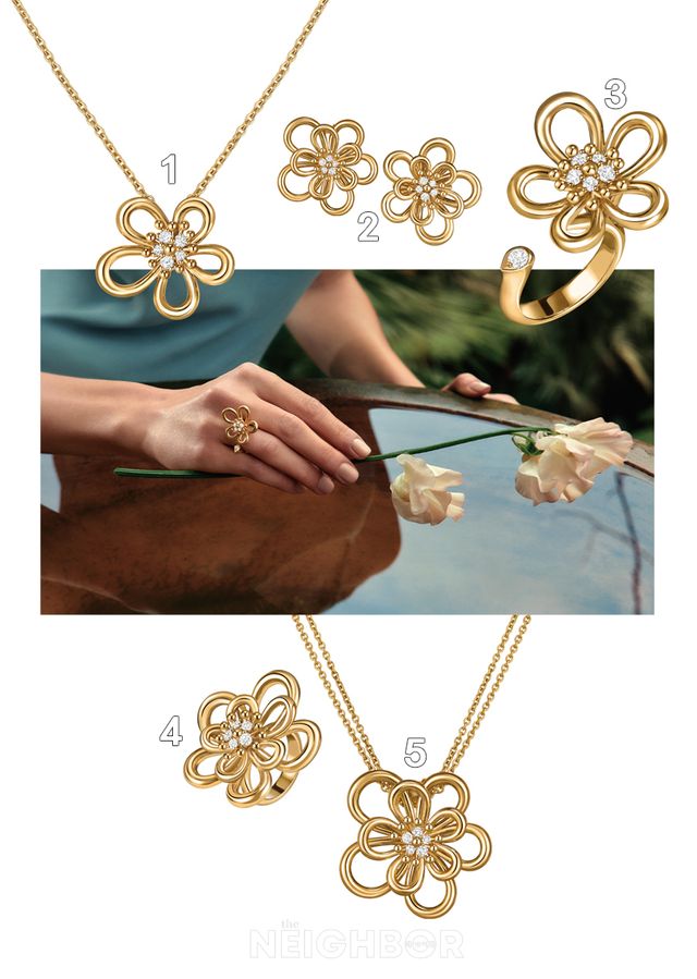 1 플라워레이스 펜던트 스몰 모델. 2 플라워레이스 이어링 스몰 모델. 3 플라워레이스 비트윈 더 핑거 링 스몰 모델. 4 플라워레이스 링 미디엄 모델. 5 플라워레이스 클립 펜던트 라지 모델.