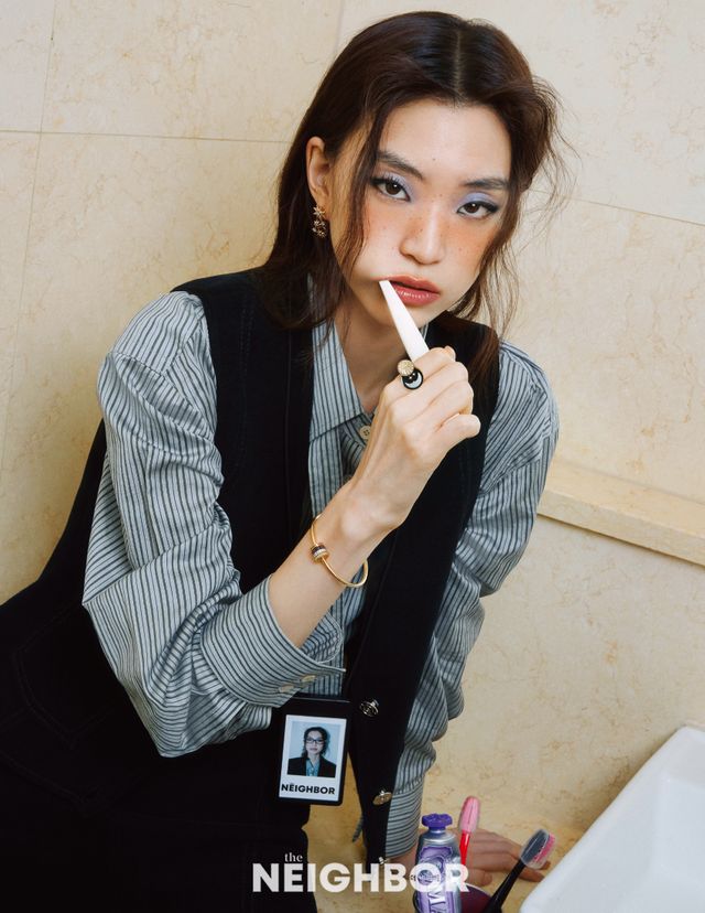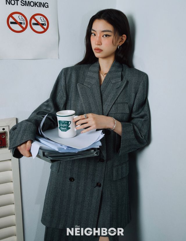 오버사이즈 재킷과 팬츠, 스트라이프 패턴 블라우스 모두 Ami, 포인티드 토 부티 Hermès.