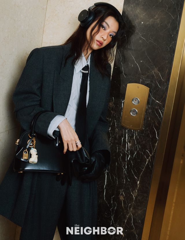 울 소재 재킷과 팬츠, 코튼 셔츠, 타이, 가죽 글러브 모두 Saint Laurent by Anthony Vaccarello, 카프스킨 소재 틴 오노린 백 Celine, 르 샤 드 라 메종 키링 Valentino Garavani, 헤드셋 Bang&Oulfsen.
