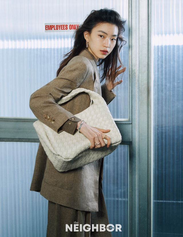 리넨 소재 재킷과 셔츠, 팬츠 모두 Loro Piana, 씨 솔트 컬러 캄파나 백 Bottega Veneta.