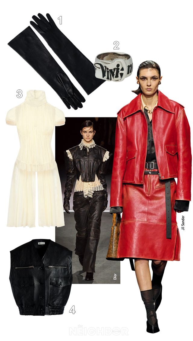 이번 시즌에는 거칠고 반항적인 느낌보다는 차분하고 정제된 스타일의 펑크 무드가 대세다. 강렬한 레드 컬러 재킷과 스커트로 시크한 매력을 선보인 질샌더 룩처럼, 은은한 광택이 감도는 레더 소재를 셋업으로 연출하면 손쉽게 트렌디한 펑크 룩을 완성할 수 있다. 여기에 지퍼, 벨트 등의 디테일을 더하면 자연스럽게 록 무드까지 구현된다.