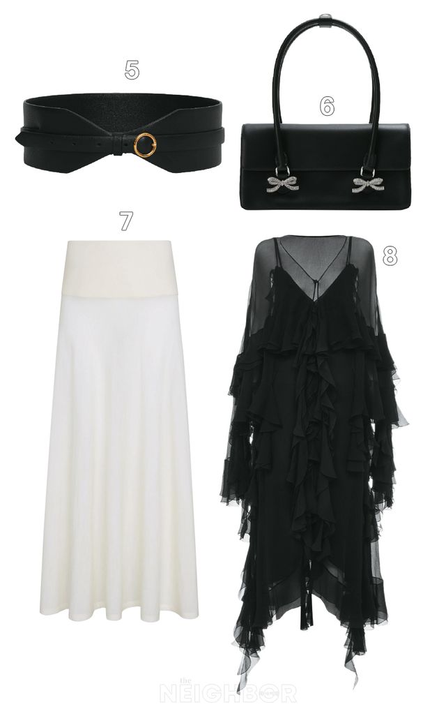 5, 7 AlaÏa 볼드한 가죽 뷔스티에 벨트, 은은하게 비치는 니트 플레어스커트 모두 가격 미정.