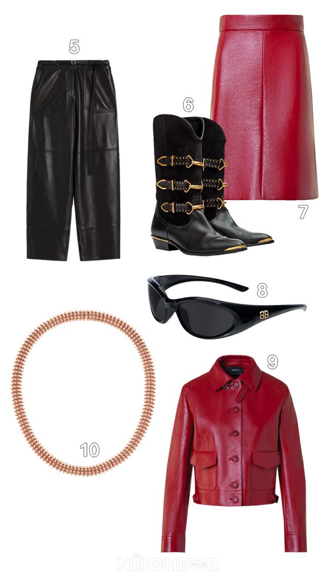 7, 9 Akris 래커 처리로 광택을 더한 레드 컬러 양가죽 보머 재킷과 A라인 스커트 모두 가격 미정.