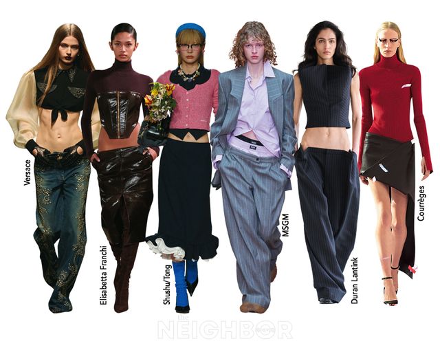 하의를 허리선 훨씬 아래로 내려입는 로라이즈 패션이 이번 시즌 다시 빛을 발했다. 2000년대 초 톱 셀러브리티의 사랑을 받으며 전성기를 누린 로라이즈 스타일은 슬릿 스커트, 슈트 팬츠 등 다양한 아이템에 적용되며 끊임없이 진화 중이다. 베르사체는 로라이즈 데님 팬츠에 아슬아슬한 미니 크롭트 셔츠를 매치해 복부를 과감히 드러낸 반면, 꾸레쥬는 몸에 밀착되는 긴 톱에 로라이즈 미니스커트를 매치해 우아하면서도 미래적인 분위기를 완성했다. 이 같은 과감한 로라이즈 룩이 부담스럽다면 슈슈통의 스타일링을 참고해볼 것. 로라이즈 미디스커트에 세미 크롭트 셔츠와 카디건을 매치하면 세련되면서도 사랑스러운 무드를 연출할 수 있다.