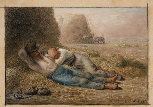 장 프랑수아 밀레(1814~1875)는 프랑스 사실주의 화가로 소박한 농민의 삶과 노동의 신성함을 화면에 담아낸 화가다. 농민 부부가 힘겹게 보리를 벤 뒤 보리 더미 그늘에서 낮잠 자는 모습을 절묘하게 포착했다. 파스텔톤의 색채와 명암 대비, 선의 디테일을 살려 고달픈 농부의 애환을 잘 담아냈다.