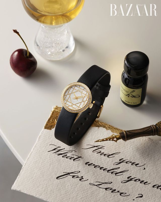 옐로 골드와 화이트 머더오브펄, 블랙 새틴 브레이슬릿이 조화로운 ‘라 디 마이 디올’ 워치는 Dior Timepiece.