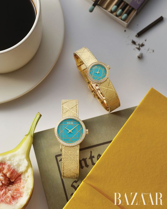 (위부터) 튀르쿠아즈 래커 다이얼에 골든 까나쥬 인그레이빙을 더한 ‘라 미니 디 마이 디올’ 워치, 베젤에 50개의 브릴리언트 컷 다이아몬드가 세팅된 ‘라 디 마이 디올’ 워치는 Dior Timepiece.