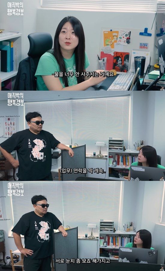개선할 점을 묻는 매직박의 질문에 직원은 "물이 회사에 구비가 안 돼 있다"며 충격적인 발언을 했다. 이에 매직박에게 직원은 "물을 안 사 준다고요?"라며 놀람을 금치 못했고, 직원은 "물이 없어서 개인 카드로 물을 사 온 적이 있다. 근데 다음 주에 정수기 설치해 주시기로 하셨다"며 기쁨을 드러냈다.