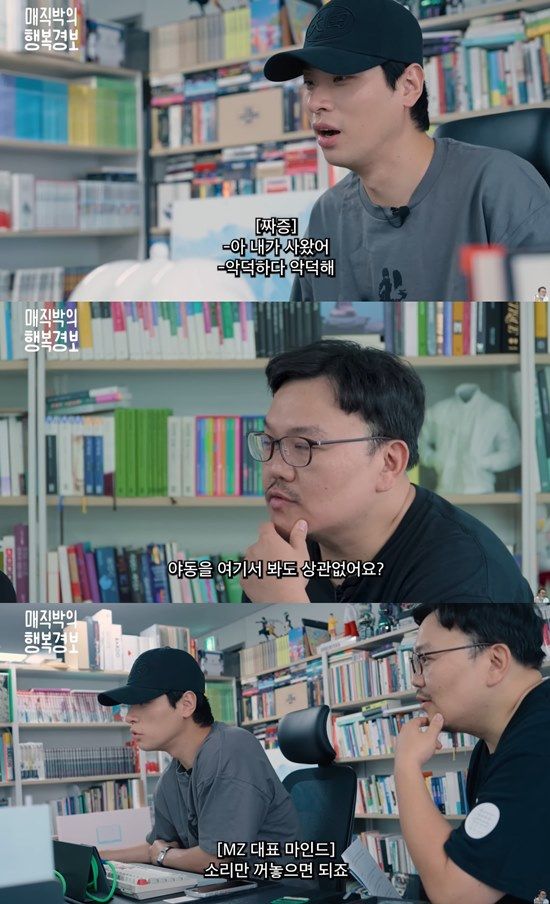 더하여 직원은 "회사에 들어오고 대표님과 연락을 안 한 날이 없었다. 그래서 서로 눈치 좀 보죠? 라고 말했다"고 전했다. 이에 매직박은 휴가 때도 못살게 구는 박정민을 구박하다 멈추고는 "요즘 젊은 친구들이 이래요"라며 '꼰대미'를 발산했다.