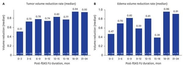 그 결과 종양 10개 중 8개는 부피가 절반 이상으로 감소했고, 종양의 부피가 최대로 줄어드는 데 걸린 시간은 중앙값 3.3개월이었다. 종양 및 부종의 부피는 치료 후 6~9개월까지 지속적으로 감소해 약 80% 줄어들었다. 이어서 18개월까지 일시적인 부피 변동이 있었지만, 18개월부터는 안정적으로 유지됐다. 이 결과는 분획 감마나이프 방사선 수술이 종양 뿐 아니라 주변 부종까지 줄여 신경학적 증상을 완화할 수 있음을 시사한다. 실제로 전체 환자의 87.1%는 수술 후 6개월 이내에 신경학적 증상이 안정 또는 개선됐다.