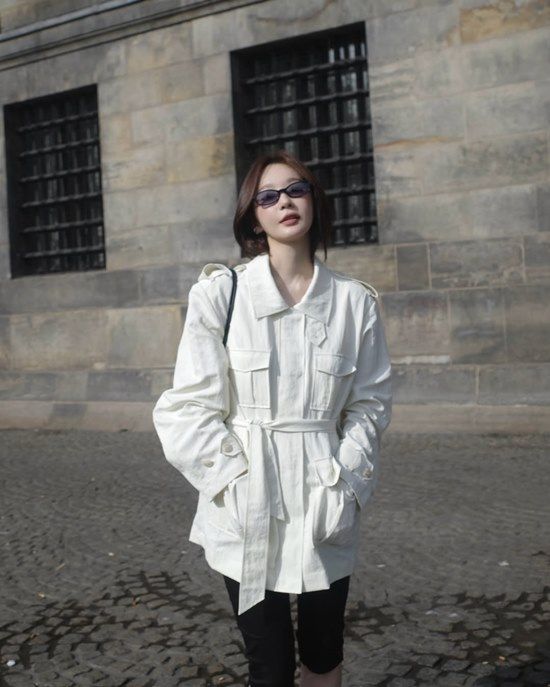 한국보다 쌀쌀한 날씨인 네덜란드로 떠난 강민경은 하얀색의 벨티드 자켓을 걸치고 선글라스를 낀 채 거리를 걷고 있다. 먼 나라인 네덜란드에서도 연예인 아우라가 물씬 풍긴다.
