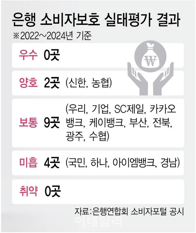 3일 은행연합회 소비자포털 공시에 따르면 지난해 금융감독원 소비자보호 실태평가를 받은 6개 은행 중 KB국민·하나·경남은행과 iM뱅크는 종합 성적표에서 ‘미흡’ 등급을 받았다. H지수 주가연계증권(ELS) 불완전판매 등으로 사회적 물의를 일으켜 금감원이 등급을 한 단계 하향 조정한 결과다. 소비자보호 실태평가는 우수, 양호, 보통, 미흡, 취약 등 5개 등급으로 지난해 금감원이 평가한 총 26개 금융회사 중에서 은행권은 모두 보통·미흡 등급을 받았다. 삼성화재·KB손해보험과 현대캐피탈이 각각 양호 등급을 받은 것을 고려할 때 은행권 소비자보호 실태가 2금융권에 비해서도 뒤처지고 있는 셈이다.
