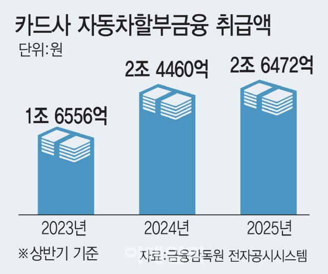 3일 금융감독원 전자공시시스템에 따르면 전업 카드사 6곳의 올해 상반기 자동차 할부금융 취급액은 2조 6472억원으로 집계됐다. 지난해 같은 기간(2조 4460억원)과 비교해 8.2% 증가했다.