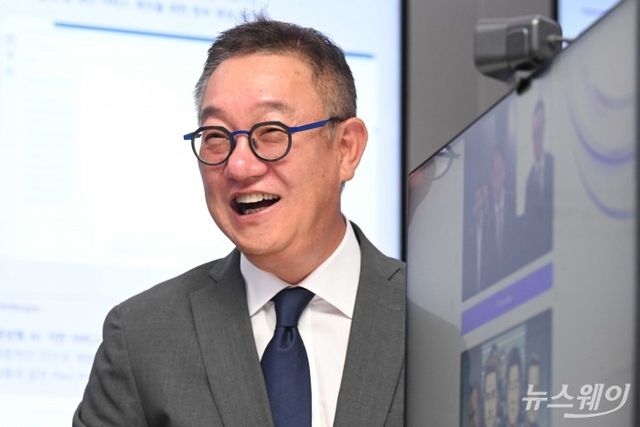 현신균 LG CNS 대표가 9일 오후 서울 강서구 LG사이언스파크에서 열린 AI 디자인 확산 전략 행사에 마련된 GEN AI 스튜디오에서 생성형AI 기반 캐리커처 카메라를 체험하며 미소를 짓고 있다. 사진=강민석 기자 kms@newsway.co.kr