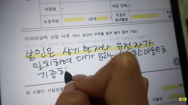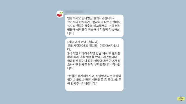 ✓ 김나영은 10여 년 전 등록해둔 유전자 정보가 환자와 일치해 조혈모세포 기증을 진행하게 되었다.