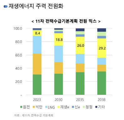산업통상자원부, 환경부 등 관계부처에 따르면 정부는 2035년까지의 국가온실가스감축목표(Nationally Determined Contribution·NDC) 관련해 이달 중에 정부 초안을 만들고, 내달 말에 최종안을 확정할 방침이다. 제11차 전력수급기본계획(전기본)에 따르면 2038년까지 재생에너지·원전 등 무탄소 발전 비중이 70%를 넘어야 한다. 2023년 발전량 비중 8.4%인 재생에너지를 2038년까지 29.2%로 올리는 내용도 포함됐다. 새정부는 전기본의 재생에너지 보급목표를 더 올리겠다는 방침이다.