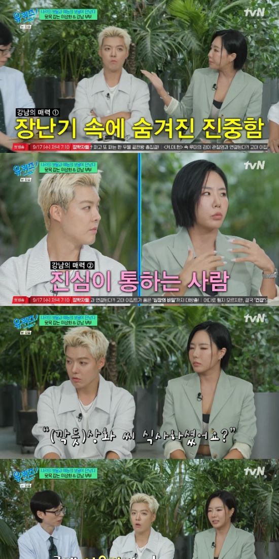 이상화는 강남의 매력에 대해 "장난기 속에 숨어진 진중함, 그리고 대화를 할 때 진심이 통했고, 무엇보다 어른들한테 예의가 너무 발랐다"고 설명했다. 유재석 역시 "강남 씨가 친화력이 너무 좋아. 트로트 대선배들이 너무 예뻐하더라"고 공감했다.