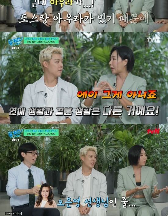 이에 이상화는 "연애와 결혼은 다르다. 결혼을 했으면 미래를 함께 생각해야하지 않냐. 그래서 이 남자가 주체못했던 장난기를 결혼해서는 절제를 해야한다고 생각한다"고 했고, 유재석은 "지금 오은영 선생님 같다"고 말하며 웃었다.