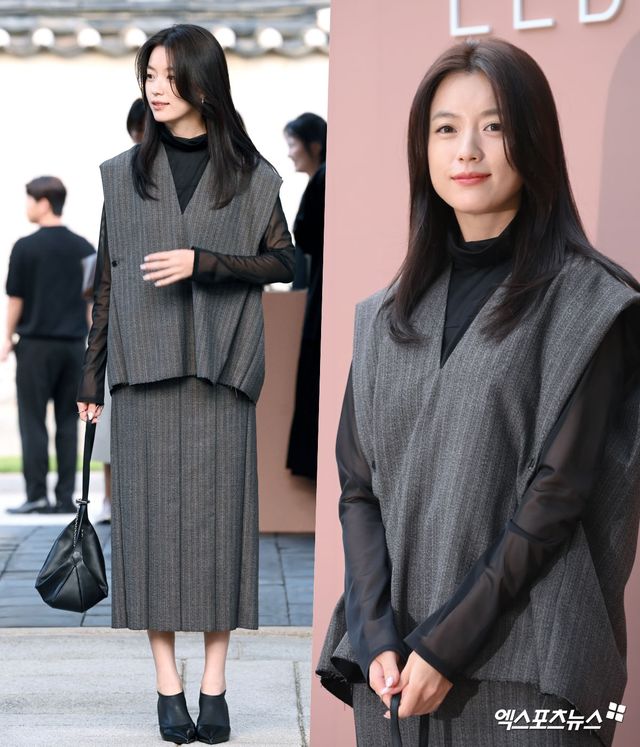 그레이 핀스트라이프 패턴의 베스트와 스커트 세트를 매치한 뒤, 블랙 시스루 톱을 레이어드해 단조롭지 않은 포인트를 더했다. 여기에 블랙 스틸레토 힐과 미니멀한 핸드백을 더하며 한효주 특유의 우아하면서도 담백한 분위기를 완성했다.