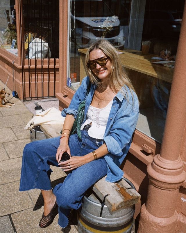 데님 셔츠와 와이드 팬츠에 블랙 톱을 더한 간결한 조합. 커피 한 잔과 함께하는 일상 속 청청패션이 떠오르는데요. 하지만 오버사이즈 선글라스와 구조적인 빅 백을 더하자 곧바로 세련된 무드가 가미되는군요. 여기에 마지막은 스니커로 힘을 뺀 덕분에 도시적이면서도 경쾌한 실루엣이 완성됐습니다.