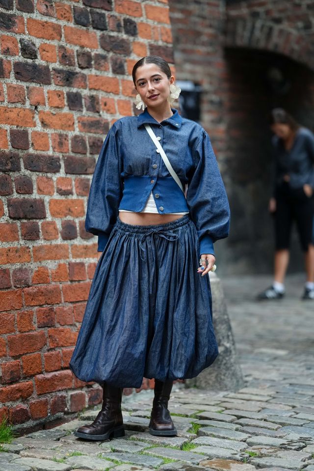 볼륨감 있는 데님 재킷과 스커트를 한 벌처럼 매치한 룩. 허리 라인을 드러낸 크롭 디테일 덕분에 답답함은 전혀 없습니다. 무겁게만 느껴지던 데님이 드레스처럼 연출되며 고풍스러운 매력과 스트리트 무드가 절묘하게 섞였죠. 마지막으로 워커를 더하니 로맨틱한 청청 룩에 힘 있는 밸런스가 완성됩니다.