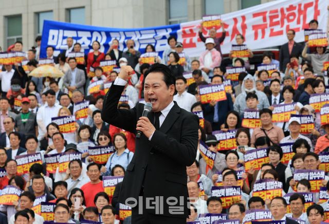 국민의힘은 조은석 내란특검팀의 원내대표실·원내행정실 압수수색 시도 사흘째인 4일 오전, 국회 본관 중앙계단에서 ‘야당 말살 정치 탄압 특검 수사 규탄대회’를 개최했다. 국민의힘 소속 의원들과 전국에서 온 당원들이 함께 빗속에서 우의를 입고 정부·여당을 성토했다.