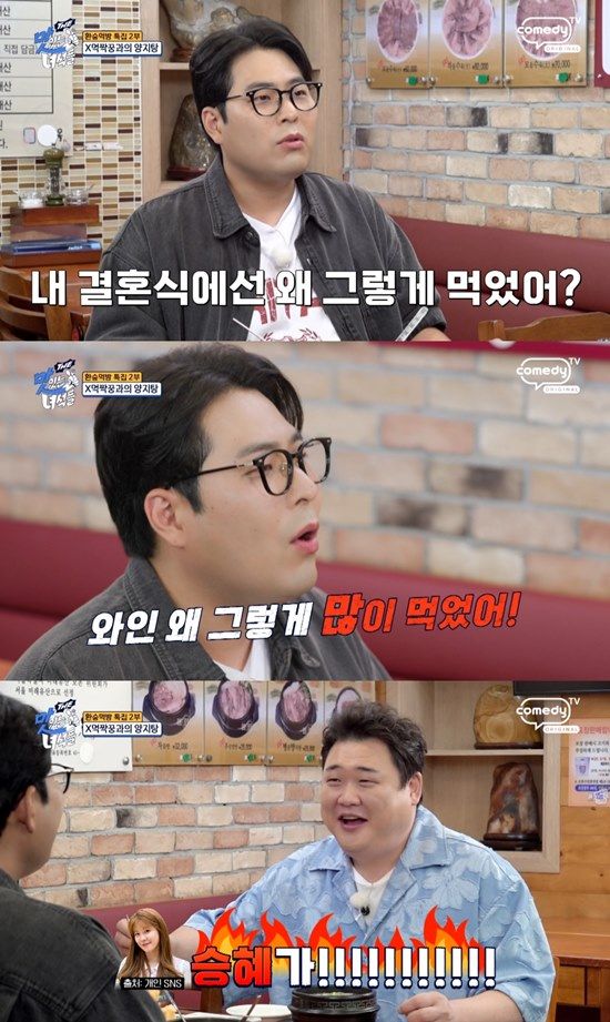 당황한 김준현은 "승혜가 먹어도 된다고 했어. 스테이크 3장 드시라고 했다"며 상황을 설명한다. 그러나 김해준은 곧바로 "승혜는 선배가 얼마나 먹는지 모르잖아. 나는 알잖아"라고 반박해 웃음을 자아낸다.