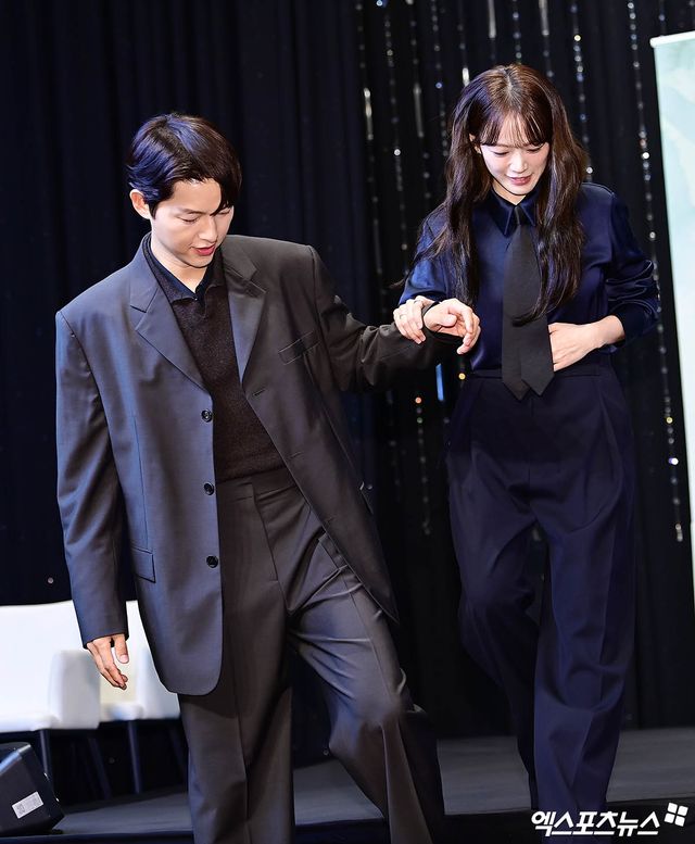 각 배우들의 개인컷 촬영에 이어 커플 포토타임이 진행되자, 송중기는 천우희를 에스코트 하며 무대에 올랐다.